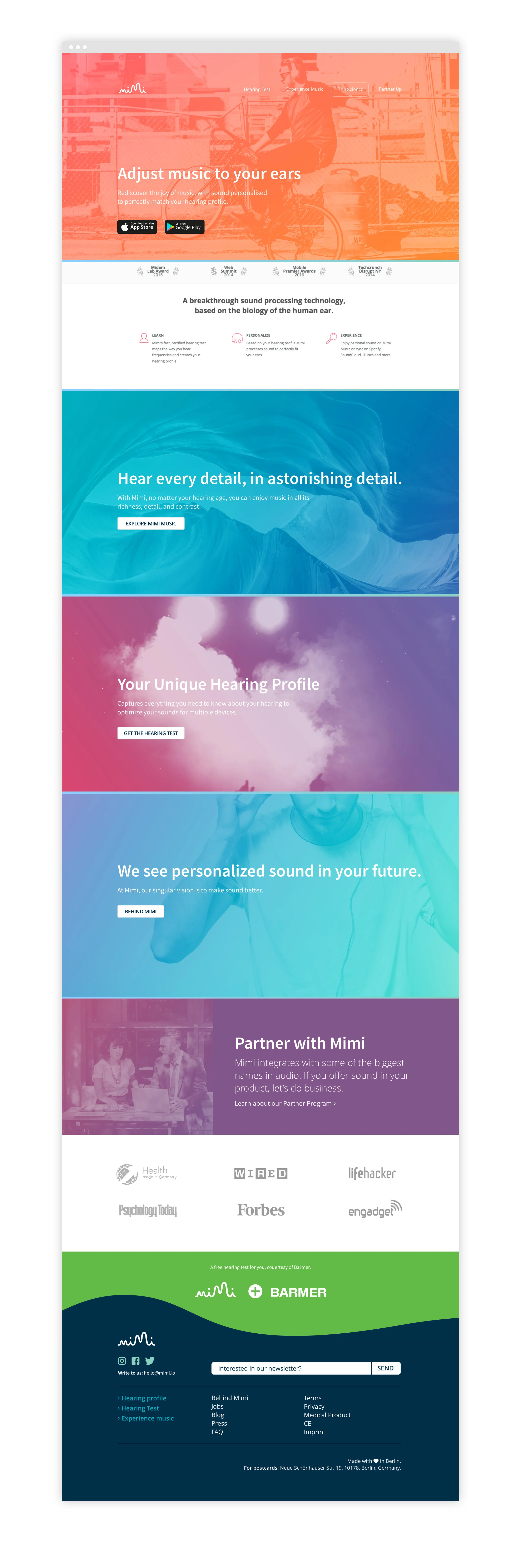 Thoughts: My experience of using the mimi technology blew my mind. I was very pleased to see it clearly enhancing my experience of my favorite music. I think it would be interesting to refine the most relevant aspects of the brand book and to create a coherent visual language for the apps (iconography & UI), the mimi web site and for Social Media. User research and defining personas in a customer journey will be relevant to redesigning the web site.